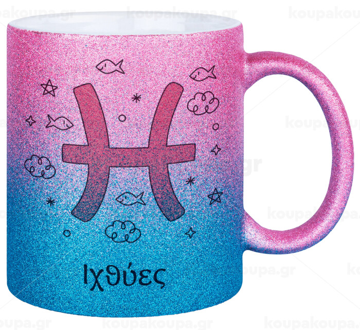 Ζώδια Ιχθύες, Κούπα Χρυσή/Μπλε Glitter, κεραμική, 330ml