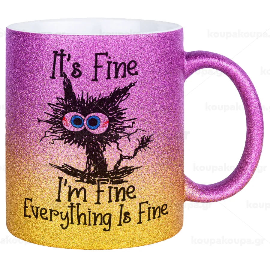 Cat, It's Fine I'm Fine Everything Is Fine, Κούπα Χρυσή/Ροζ Glitter, κεραμική, 330ml