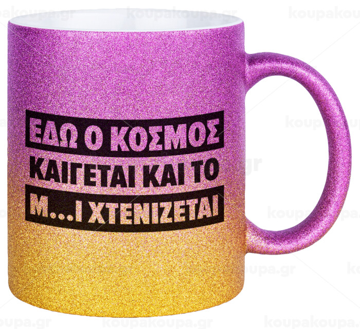 Εδώ ο κόσμος καίγεται και το Μ....Ι χτενίζεται, Κούπα Χρυσή/Ροζ Glitter, κεραμική, 330ml