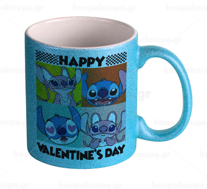 Lilo & Stitch Happy valentines day, Κούπα Σιέλ Glitter που γυαλίζει, κεραμική, 330ml