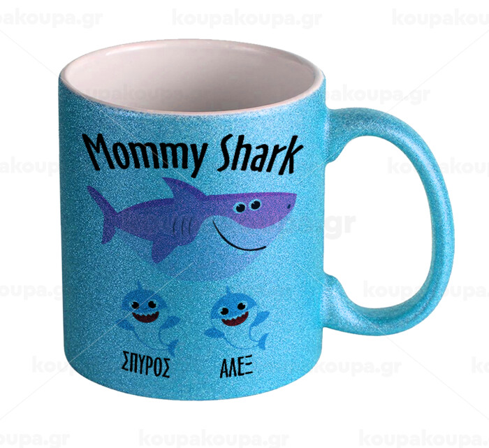 Mommy Shark (με ονόματα παιδικά), Κούπα Σιέλ Glitter που γυαλίζει, κεραμική, 330ml