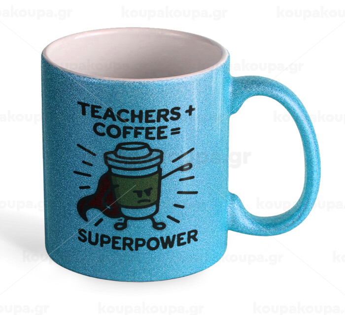Teacher Coffee Super Power, Κούπα Σιέλ Glitter που γυαλίζει, κεραμική, 330ml
