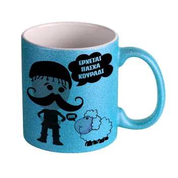 Κρητικός "Έρχεται Πάσχα κουράδι", Κούπα Σιέλ Glitter που γυαλίζει, κεραμική, 330ml