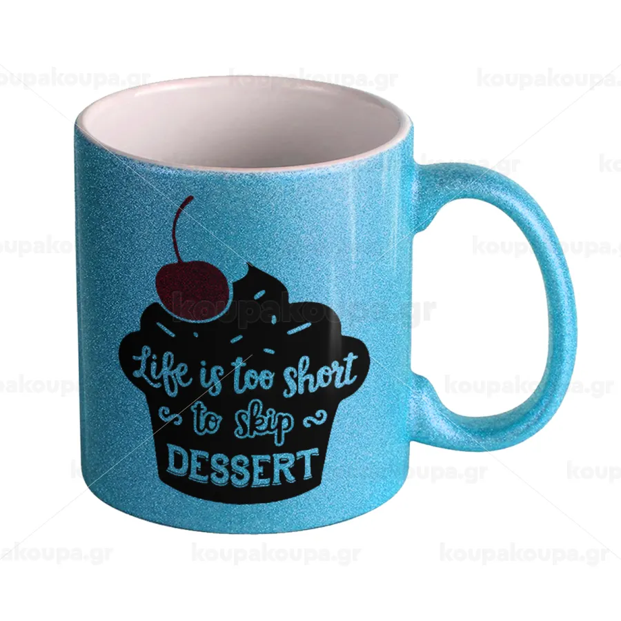 Life is too short, to skip Dessert, Κούπα Σιέλ Glitter που γυαλίζει, κεραμική, 330ml