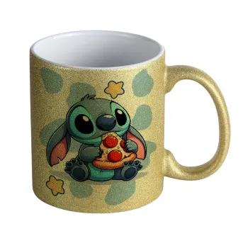 Stitch Pizza, Κούπα Χρυσή Glitter που γυαλίζει, κεραμική, 330ml
