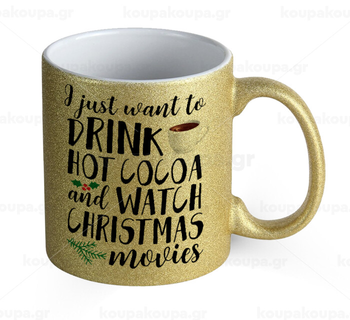 I just want to drink hot cocoa and watch christmas movies, Κούπα Χρυσή Glitter που γυαλίζει, κεραμική, 330ml