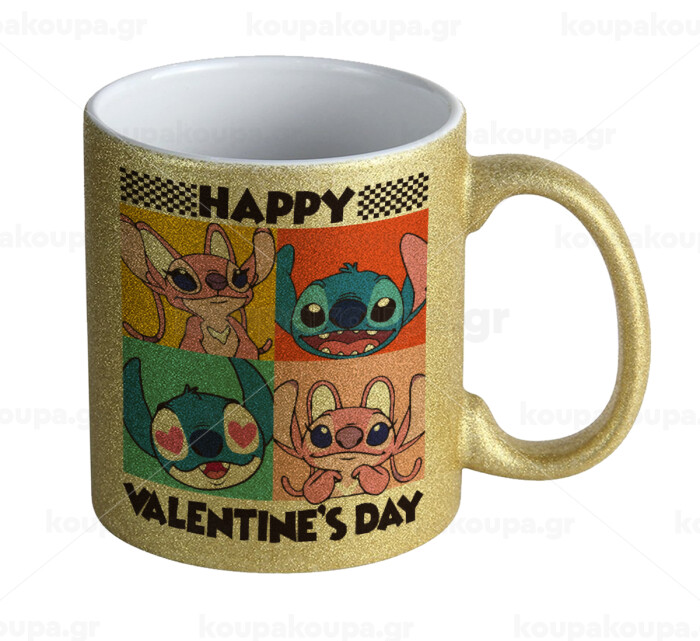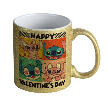 Lilo & Stitch Happy valentines day, Κούπα Χρυσή Glitter που γυαλίζει, κεραμική, 330ml