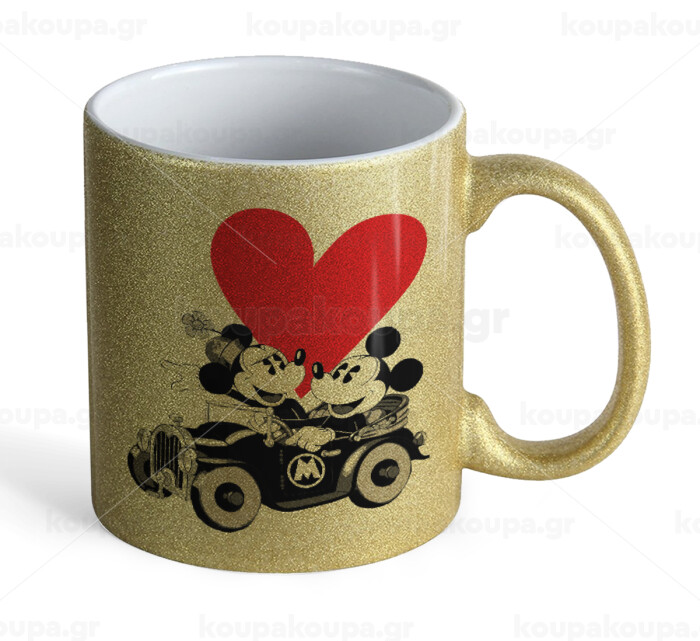 Mickey & Minnie love car, Κούπα Χρυσή Glitter που γυαλίζει, κεραμική, 330ml