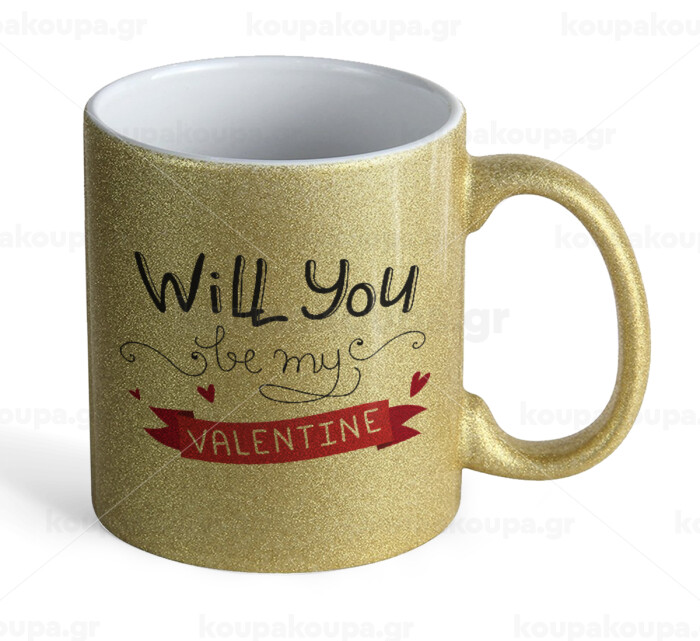 Will you be my Valentine???, Κούπα Χρυσή Glitter που γυαλίζει, κεραμική, 330ml