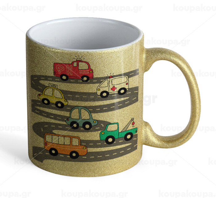 Hand drawn childish set with cars, Κούπα Χρυσή Glitter που γυαλίζει, κεραμική, 330ml