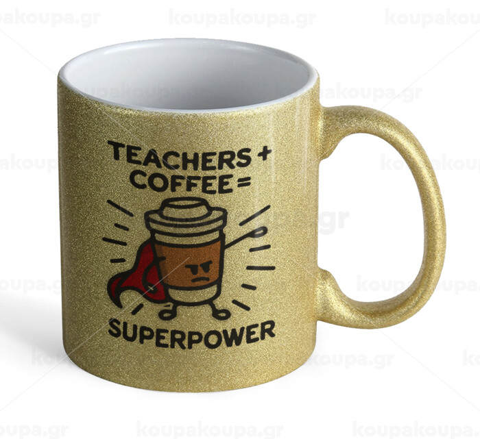 Teacher Coffee Super Power, Κούπα Χρυσή Glitter που γυαλίζει, κεραμική, 330ml