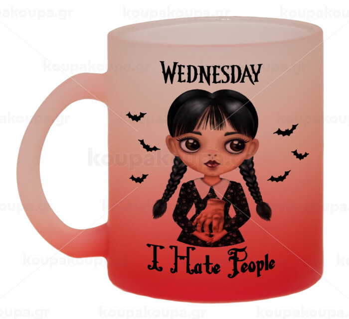 Wednesday Adams, i hate people, Κούπα γυάλινη δίχρωμη με βάση το κόκκινο ματ, 330ml