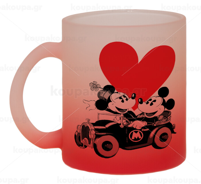 Mickey & Minnie love car, Κούπα γυάλινη δίχρωμη με βάση το κόκκινο ματ, 330ml