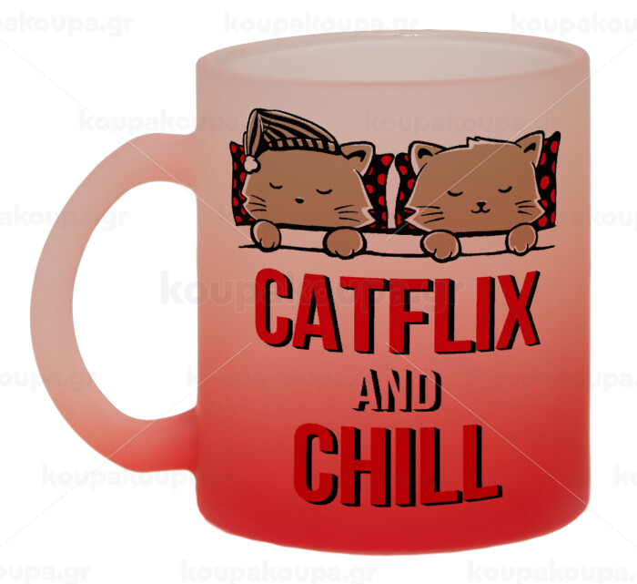 Catflix and Chill, Κούπα γυάλινη δίχρωμη με βάση το κόκκινο ματ, 330ml