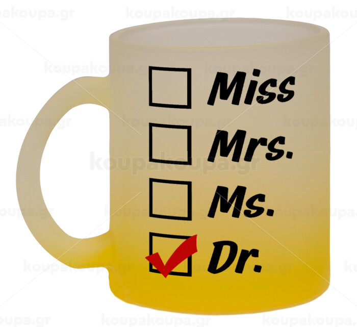 Miss, Mrs, Ms, DR, Κούπα γυάλινη δίχρωμη με βάση το κίτρινο ματ, 330ml