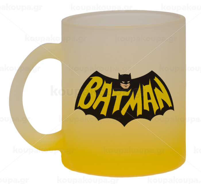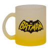 Batman classic logo, Κούπα γυάλινη δίχρωμη με βάση το κίτρινο ματ, 330ml