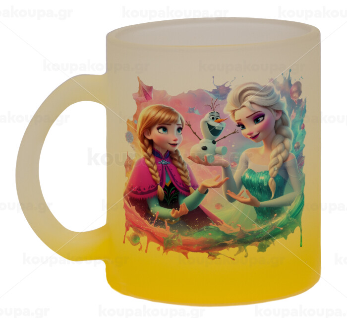 Έλσα & Άννα, Κούπα γυάλινη δίχρωμη με βάση το κίτρινο ματ, 330ml