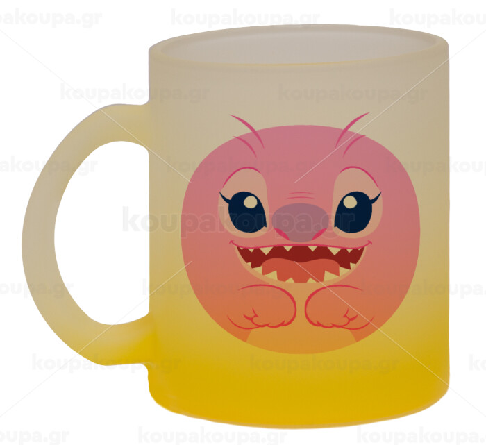 Lilo & Stitch Angel pink, Κούπα γυάλινη δίχρωμη με βάση το κίτρινο ματ, 330ml