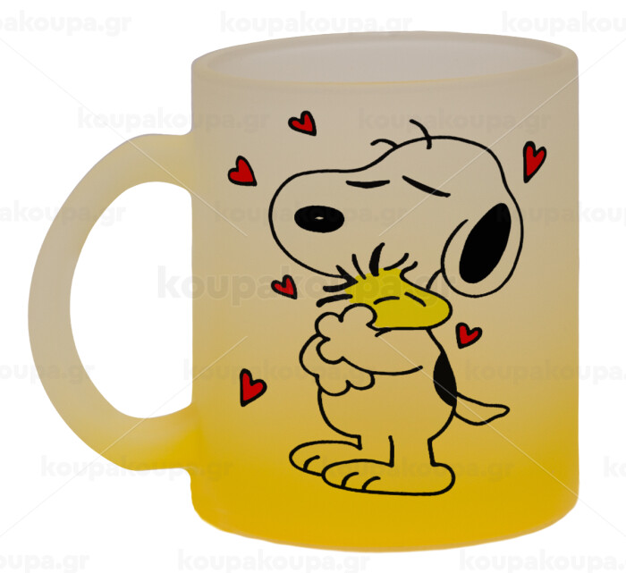 Snoopy Love, Κούπα γυάλινη δίχρωμη με βάση το κίτρινο ματ, 330ml