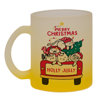 Merry Christmas cats in car, Κούπα γυάλινη δίχρωμη με βάση το κίτρινο ματ, 330ml