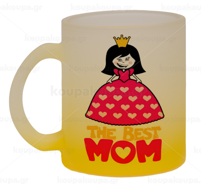 The Best Mom Queen, Κούπα γυάλινη δίχρωμη με βάση το κίτρινο ματ, 330ml