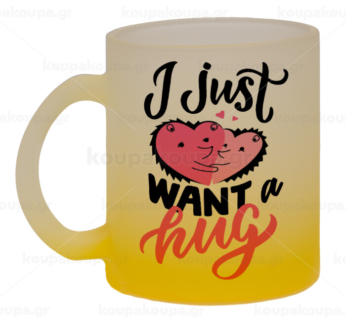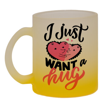 I Just want a hug!, Κούπα γυάλινη δίχρωμη με βάση το κίτρινο ματ, 330ml