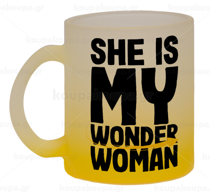 She is my wonder woman, Κούπα γυάλινη δίχρωμη με βάση το κίτρινο ματ, 330ml