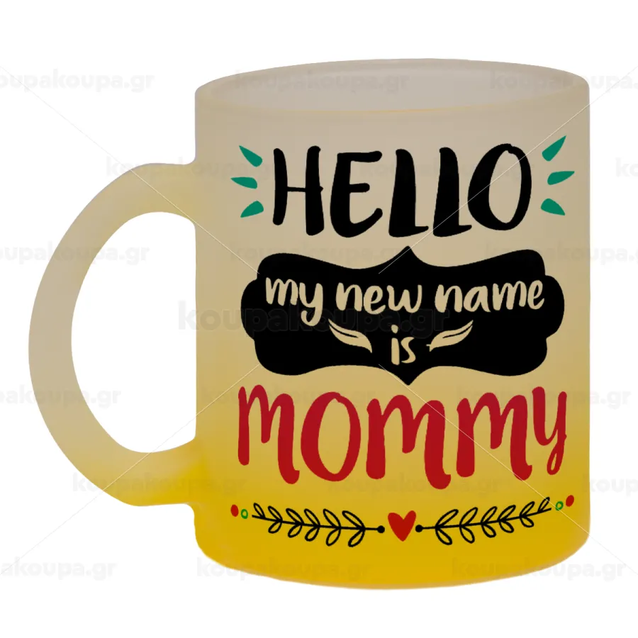 Hello, my new name is Mommy, Κούπα γυάλινη δίχρωμη με βάση το κίτρινο ματ, 330ml
