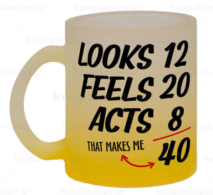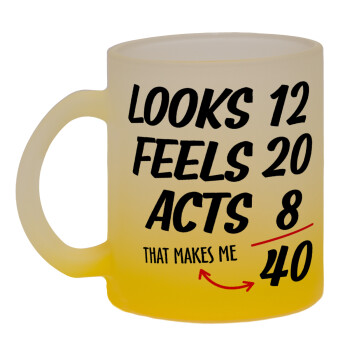 Looks, feels, acts LIKE your AGE, Κούπα γυάλινη δίχρωμη με βάση το κίτρινο ματ, 330ml