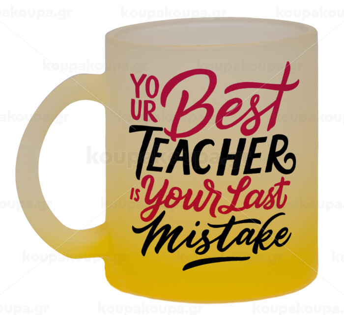Typography quotes your best teacher is your last mistake, Κούπα γυάλινη δίχρωμη με βάση το κίτρινο ματ, 330ml