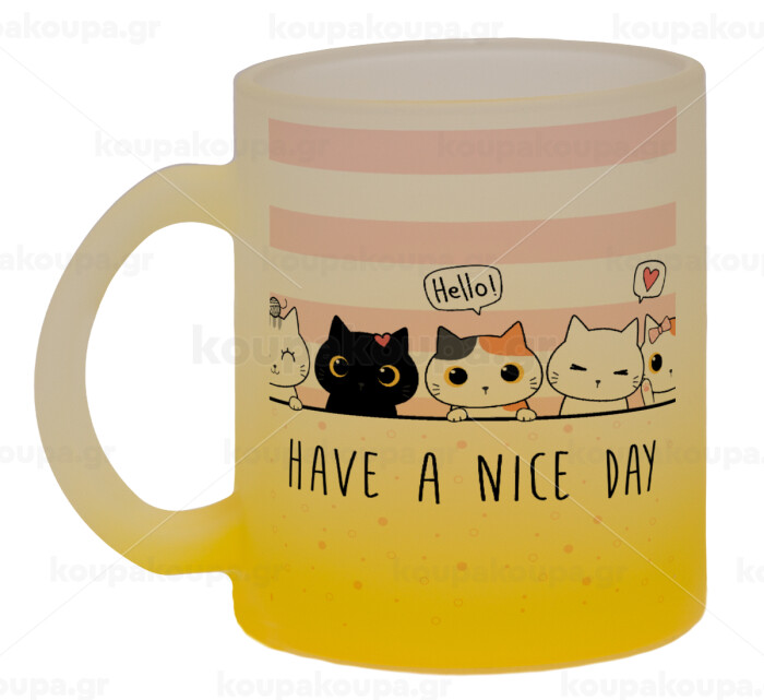 Have a nice day cats, Κούπα γυάλινη δίχρωμη με βάση το κίτρινο ματ, 330ml