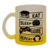 Eat Sleep Game Repeat, Κούπα γυάλινη δίχρωμη με βάση το κίτρινο ματ, 330ml
