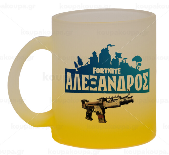 Fortnite with gun με το όνομα σου, Κούπα γυάλινη δίχρωμη με βάση το κίτρινο ματ, 330ml