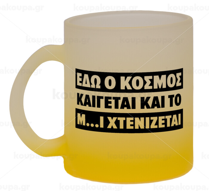 Εδώ ο κόσμος καίγεται και το Μ....Ι χτενίζεται, Κούπα γυάλινη δίχρωμη με βάση το κίτρινο ματ, 330ml