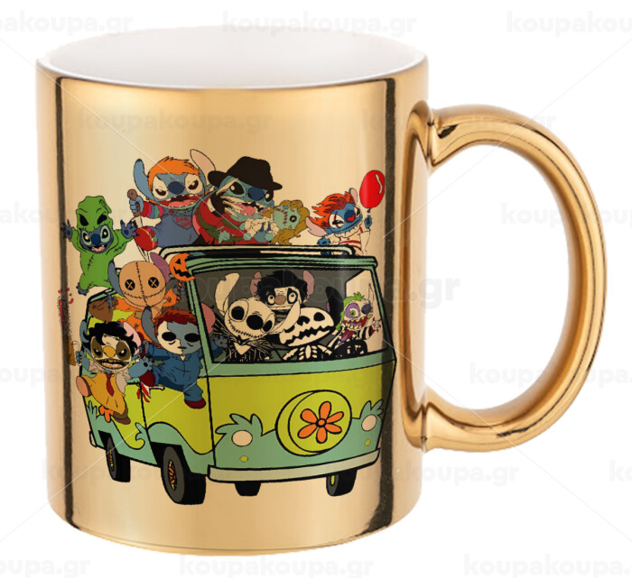 Stitch Halloween scooby car, Κούπα κεραμική, χρυσή καθρέπτης, 330ml