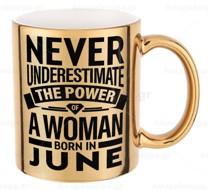 Never Underestimate the poer of a Woman born in..., Κούπα κεραμική, χρυσή καθρέπτης, 330ml