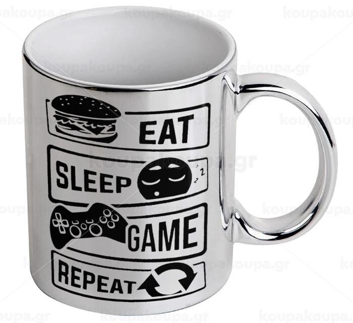 Eat Sleep Game Repeat, Κούπα κεραμική, ασημένια καθρέπτης, 330ml