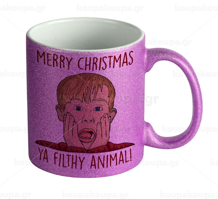 home alone, Merry Christmas ya filthy animal, Κούπα Μωβ Glitter που γυαλίζει, κεραμική, 330ml