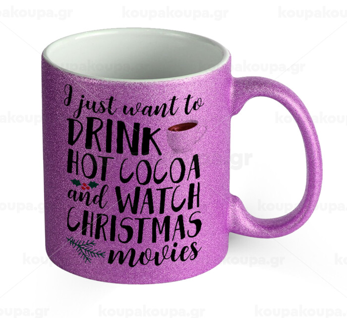 I just want to drink hot cocoa and watch christmas movies, Κούπα Μωβ Glitter που γυαλίζει, κεραμική, 330ml