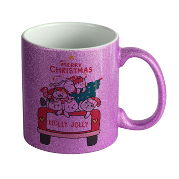 Merry Christmas cats in car, Κούπα Μωβ Glitter που γυαλίζει, κεραμική, 330ml