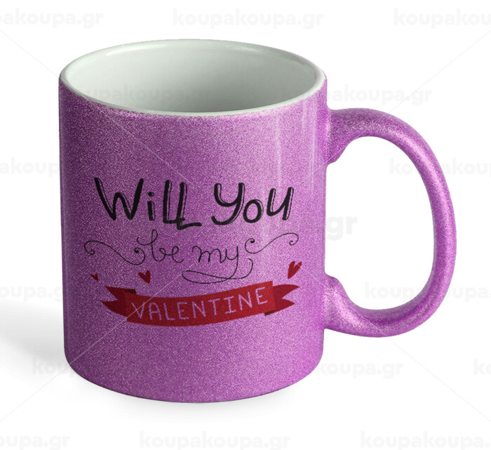 Will you be my Valentine???, Κούπα Μωβ Glitter που γυαλίζει, κεραμική, 330ml