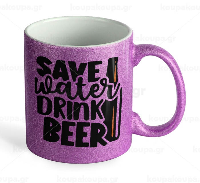 Save Water, Drink BEER, Κούπα Μωβ Glitter που γυαλίζει, κεραμική, 330ml