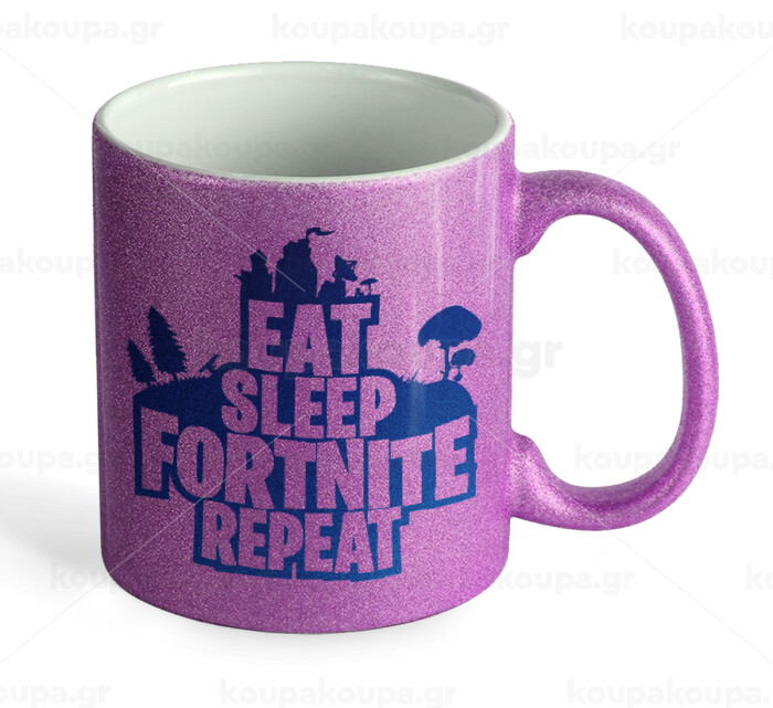 Eat Sleep Fortnite Repeat, Κούπα Μωβ Glitter που γυαλίζει, κεραμική, 330ml