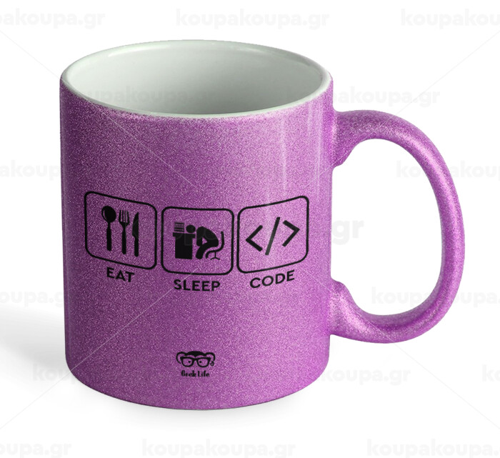 Eat Sleep Code, Κούπα Μωβ Glitter που γυαλίζει, κεραμική, 330ml