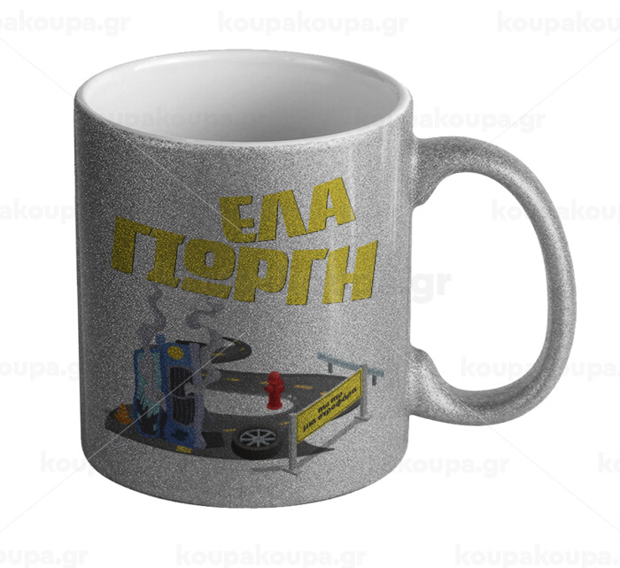 Έλα Γιώργη, πω πω μια στροφάρα, Κούπα Ασημένια Glitter που γυαλίζει, κεραμική, 330ml
