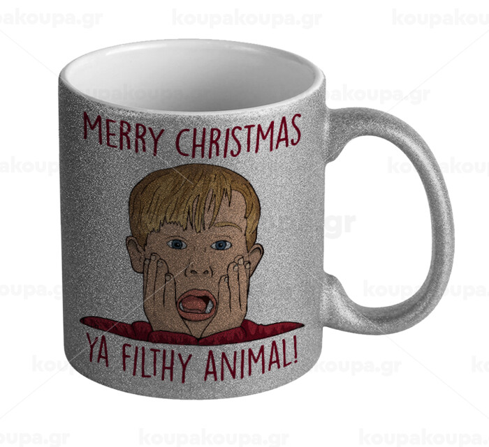 home alone, Merry Christmas ya filthy animal, Κούπα Ασημένια Glitter που γυαλίζει, κεραμική, 330ml