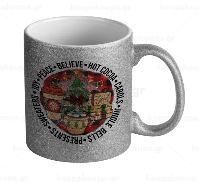 Joy, Peace, Believe, Hot Cocoa, Carols, Κούπα Ασημένια Glitter που γυαλίζει, κεραμική, 330ml