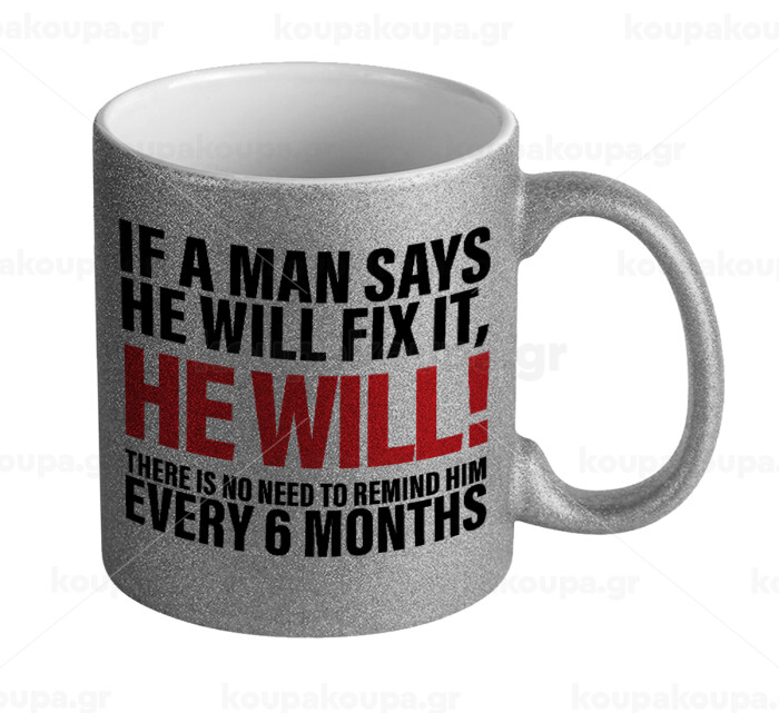 If a man says he will fix it He will There is no need to remind him every 6 months, Κούπα Ασημένια Glitter που γυαλίζει, κεραμική, 330ml