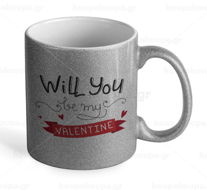 Will you be my Valentine???, Κούπα Ασημένια Glitter που γυαλίζει, κεραμική, 330ml