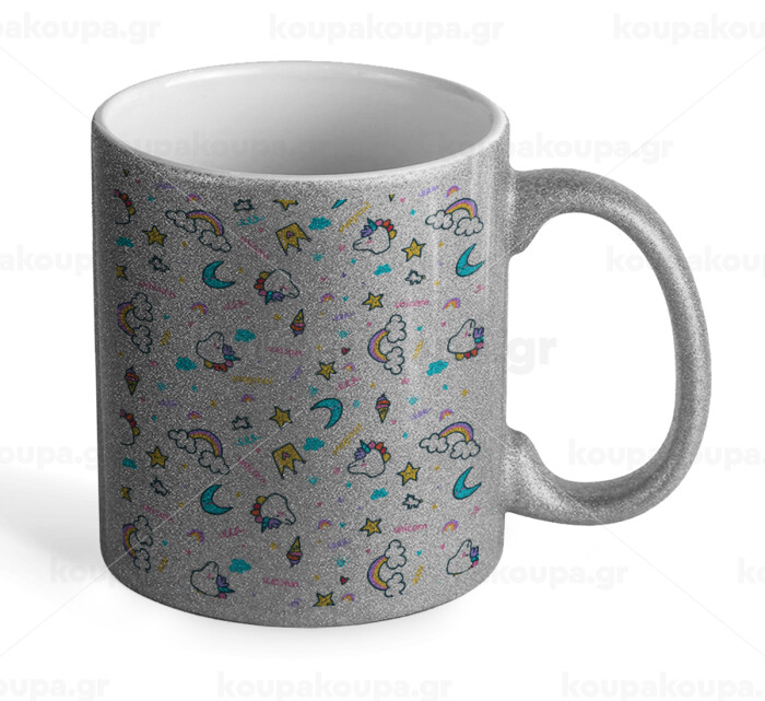 Unicorn pattern white, Κούπα Ασημένια Glitter που γυαλίζει, κεραμική, 330ml